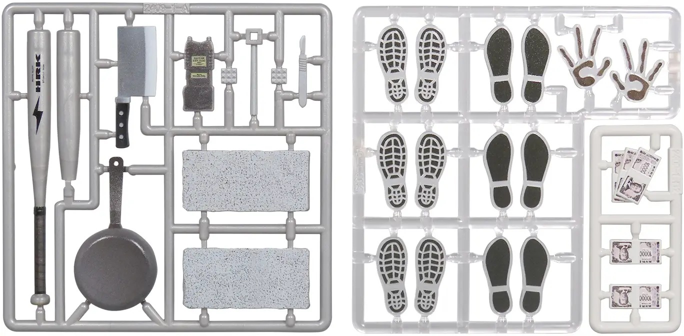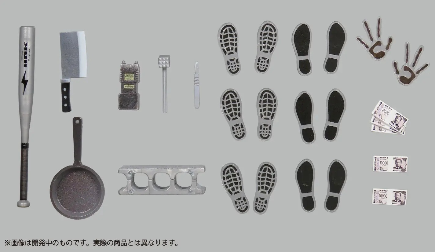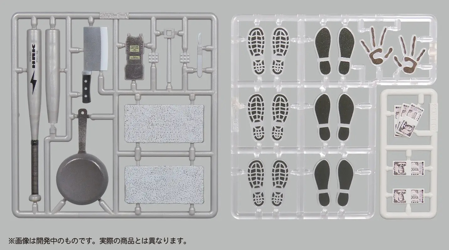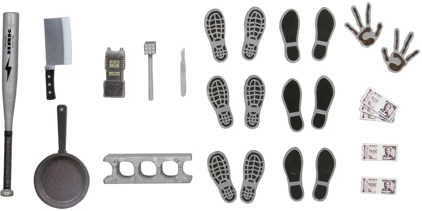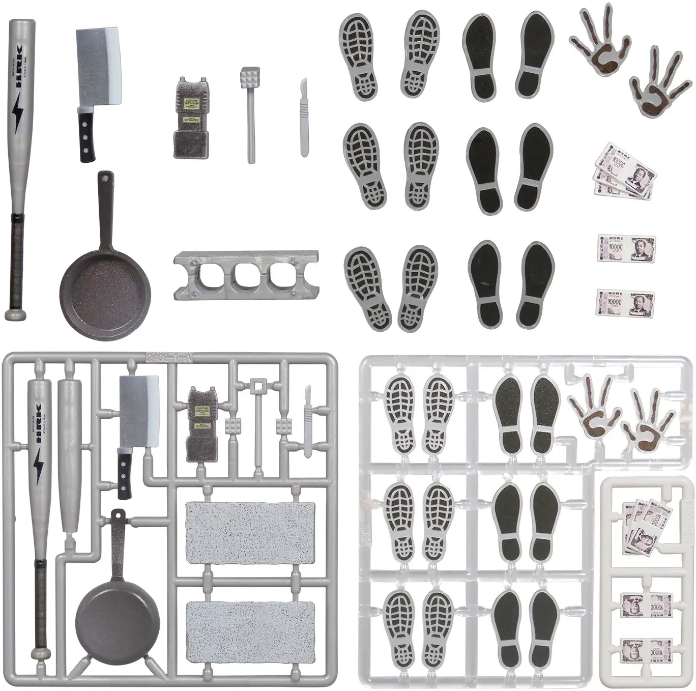 Enjoy suspenseful drama with your own 1/12-scale action figures with this new "Suspense" set from MIC's "Puripura Figure Play" series! This set includes more everyday items and tools that could be used as murder weapons, as well as parts that bring a sense of impending menace to your scenes! Alien handprints are included for even more mystery and fun! Combine these items with parts from the first two releases to expand the suspense! Order yours today!
