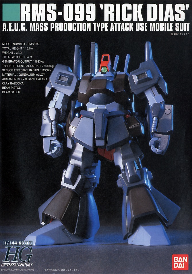 Along with the Hyaku-Shiki (Type 100), the Rick Dias is one of the most popular mecha from Zeta Gundam as it was designed by Mamoru Nagano of L-Gaim and Five Star Stories fame. This new kit does it justice, featuring overall slimmer, sharper proportions than the chunky High Complete Model or 1/100 kit of many years ago. As usual for kits in the High Grade series, it's molded in color, features snap assembly, and has poly-caps for all the moving joints.