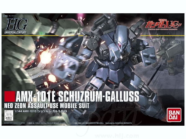 From Bandai, here's a High-Grade model kit of the AMX-101E Schuzrum-Galluss from "Gundam Unicorn". The Schuzrum Galluss comes armed with a spike shield and a chain mine. Includes stickers for markings.