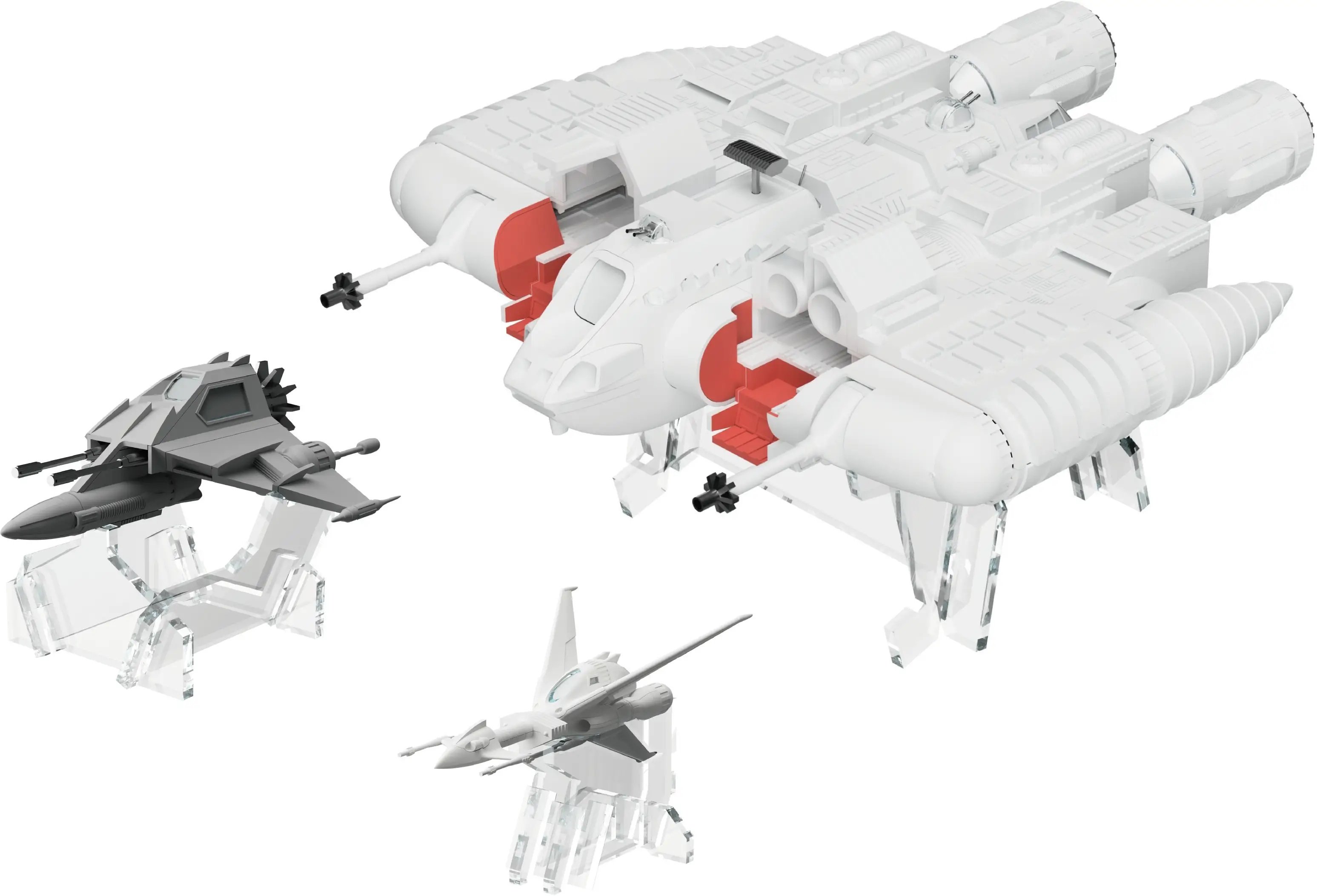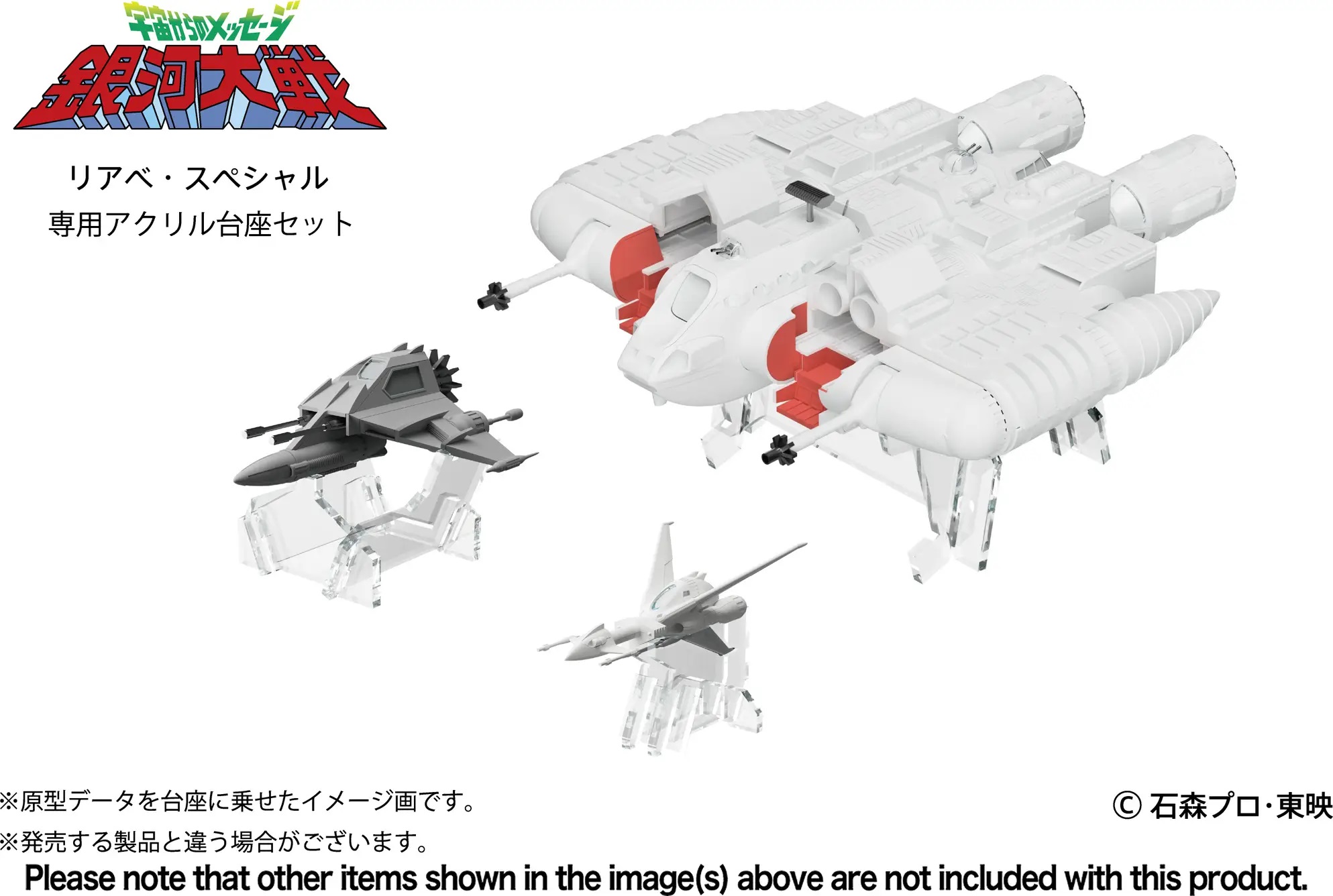 HMA brings us a set of acrylic stands made exclusively for the "Message from Space: Galactic Wars" Liabe Special model kit! This special set of stands will allow you to display the Liabe Special in flight, as well as the Comet Fire and Galaxy Runner. Each unit's name is printed on its dedicated stand, too. They're easy to assemble, and will make your display look awesome -- place your order today!