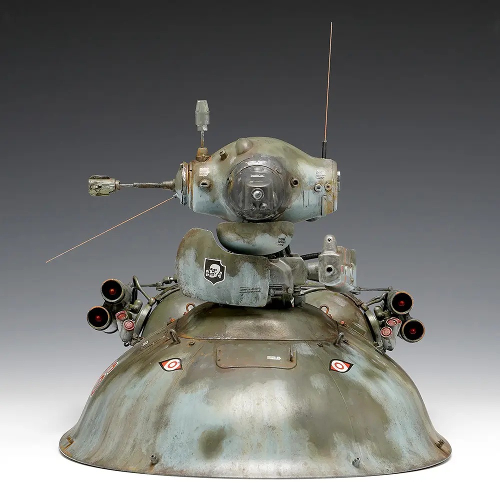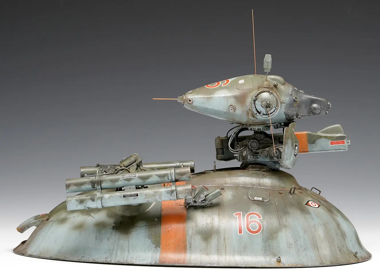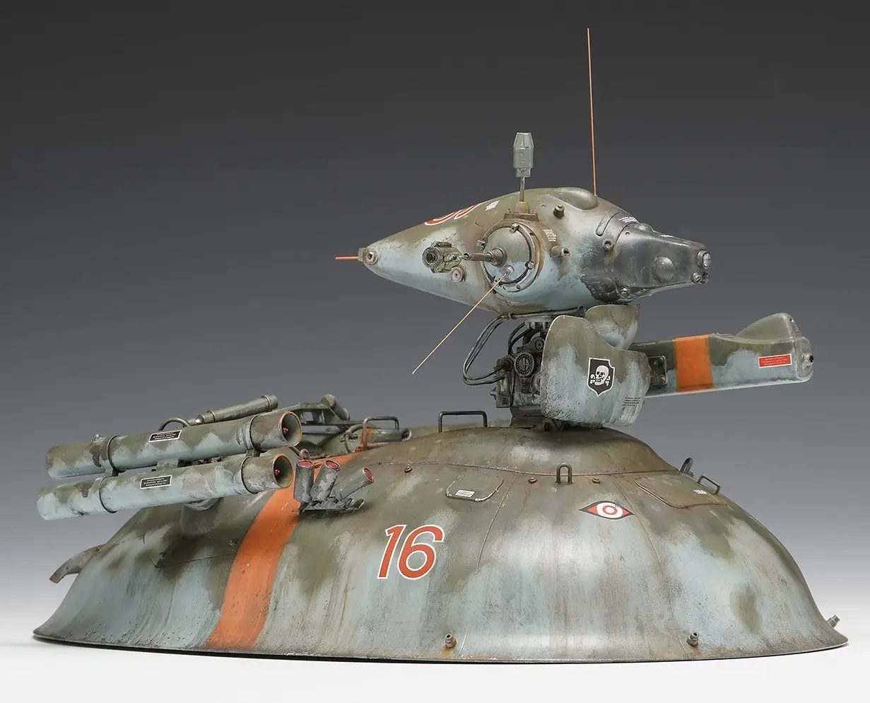 The Sturmvogel (a.k.a. Oscar) is an unmanned reconnaissance aircraft equipped with a Neusspotter head -- a sensing unit mounted on a hover-propelled armored vehicle. Wave has previously released a later version of this vehicle equipped with a linear gun, and an earlier model equipped with a laser gun. The assault reconnaissance version with a NINJA head and rocket launcher can now join your 1/20-scale "Maschinen Krieger" lineup! To enhance its rear support capabilities, it's equipped with four additional homing rockets (a field modification kit), and its head is equipped with the NINJA high-performance search seeker for a powerful silhouette. This model kit snaps together so glue isn't required, and decals are included. Place your order today!