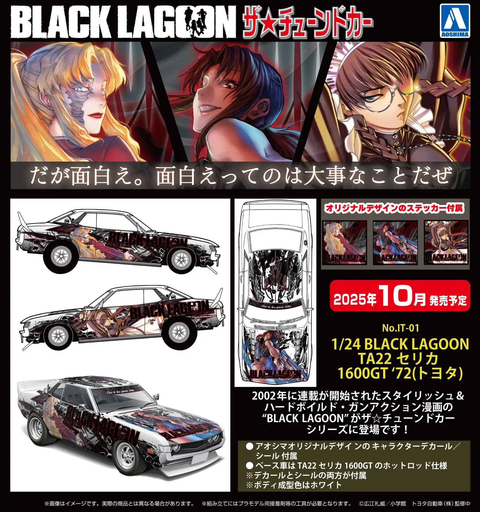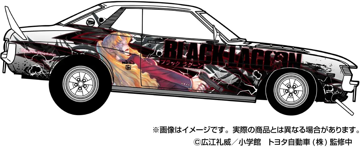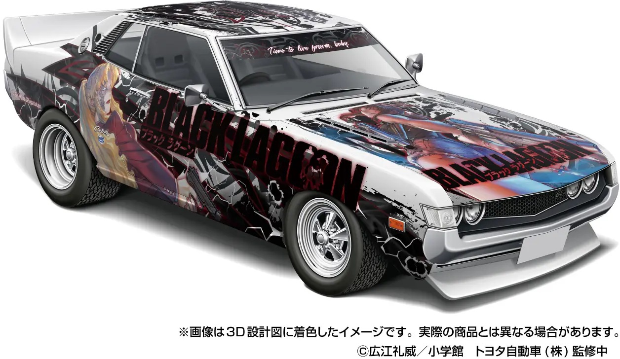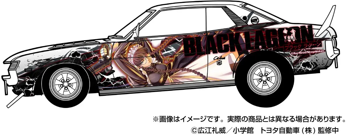 Aoshima salutes "Black Lagoon," the stylish and hard-boiled gun-action manga that began serialization in 2002, with the latest entry in their "Tuned Car" series -- a hot-rod version of the 1972 TA22 Toyota Celica 1600GT with original character decals and stickers! Three original design stickers (5cm x 5cm) are included as a bonus. This stunning car will look great displayed on your collection shelf -- place your order today!