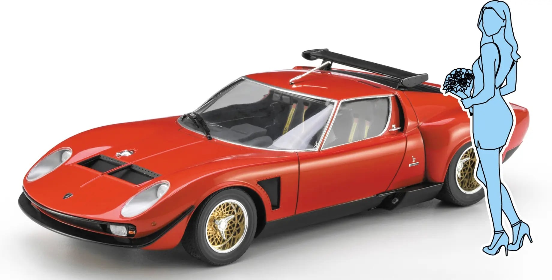 Hasegawa brings us a 1/24-scale model kit of the stunning Lamborghini Jota SVR and a 3D-printed figure kit of a beautiful, international celebrity-style woman holding a bouquet of flowers! It'll give your collection shelf that car-show feel -- order yours today!