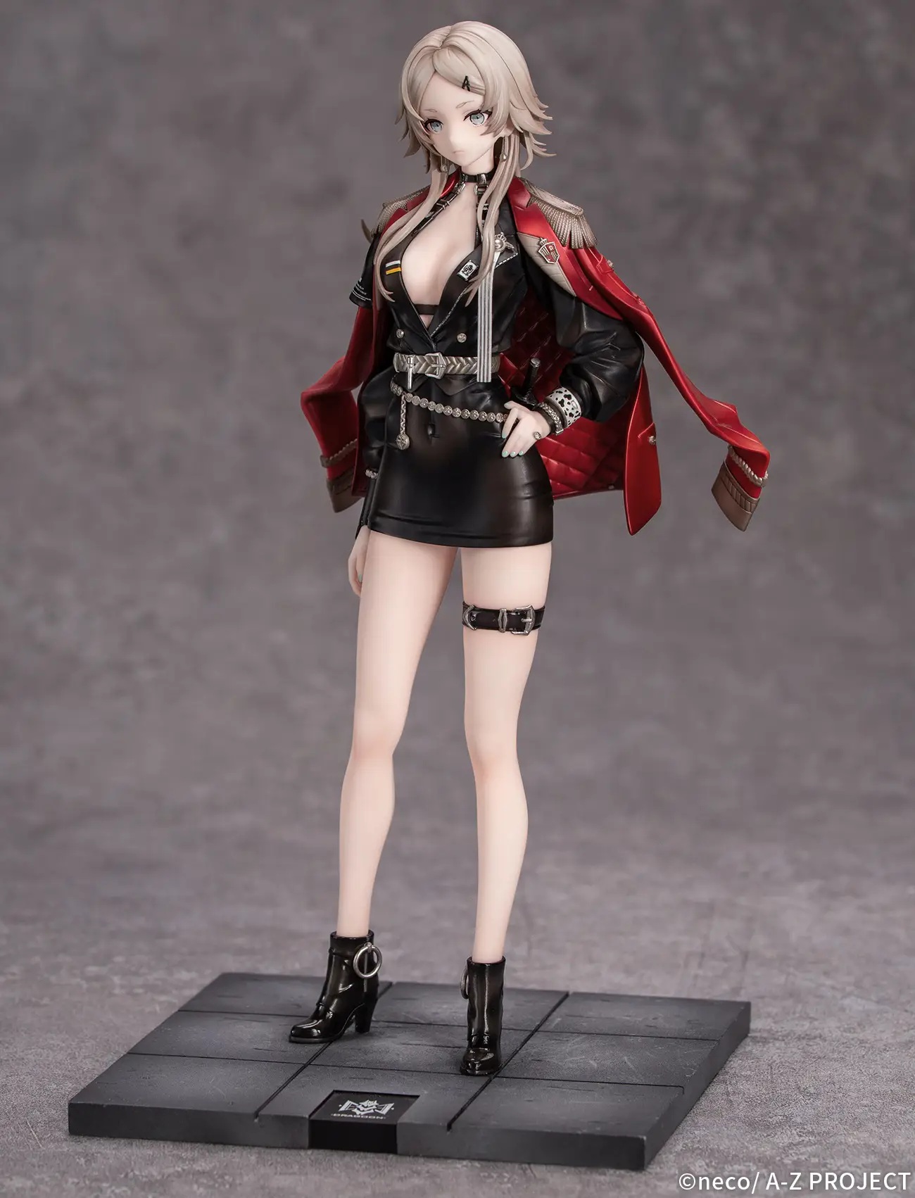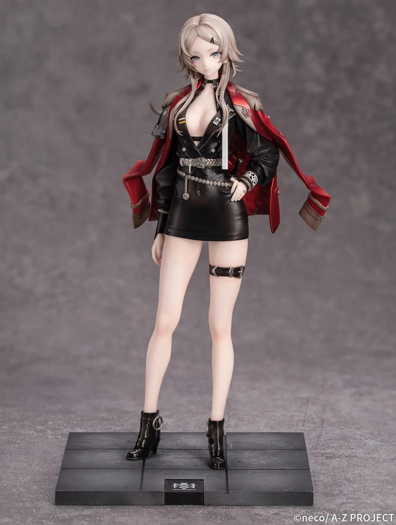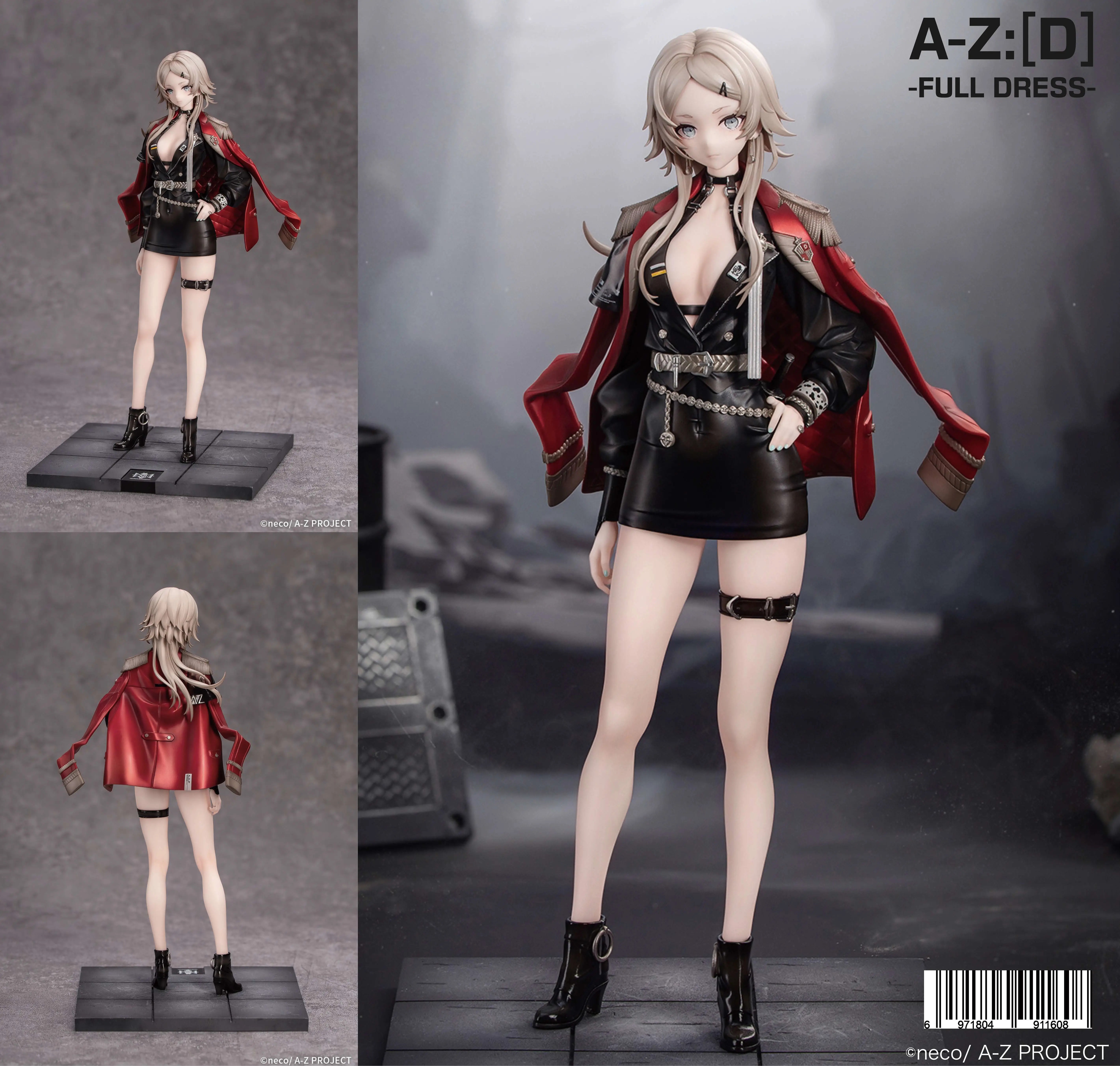[D] from the artist neco's original illustration series "A-Z:" returns to their figure lineup as the "-full dress-" version! Her gleaming red jacket features a deep gradation paint finish, creating a striking effect as her bare skin peeks out from under her deep V-neck shirt. Her tight miniskirt is made of translucent material, allowing a subtle glimpse of her skin, while the silvery belt tightens her shirt to reveal delicate creases in the fabric. Check out the attention to detail, such as the translucent short sleeve on the right side, and the metallic accessories. Her base is included. Order her for your own collection today!