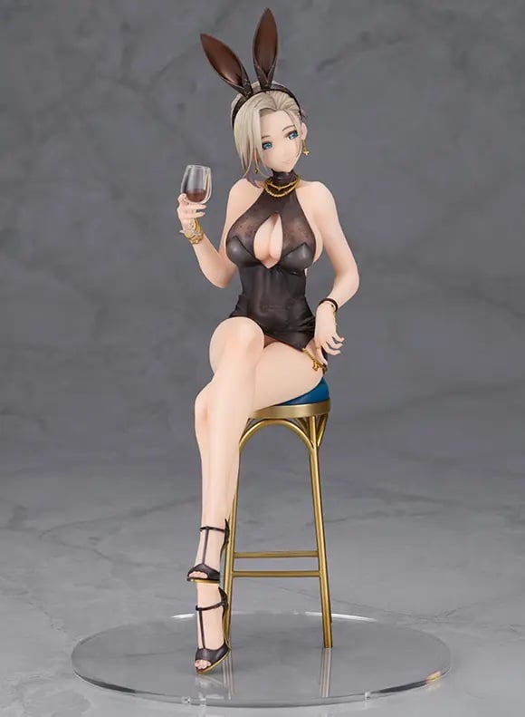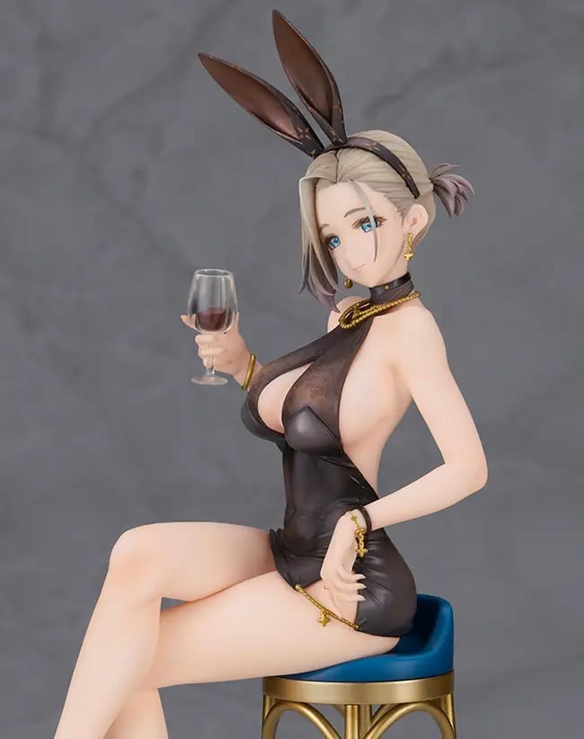 New Orleans from the popular game "Azur Lane" gets a new figure from Alter, in her "Evening Agricole" outfit! Her uniquely designed bunny suit is an elegant minidress, with intriguing lace panels over her bosom giving the outfit a halter-style neckline. She salutes you with her wineglass and a small smile; the details of her abdomen are visible thanks to the snug fit of the outfit, and subtle golden accents enliven the dark color of the costume. Alternate parts are included so you can display her without the halter-neck part of her dress, and with her hair down too! The bar stool she's seated on and a base are included too. Order her for your own collection today, Commander!