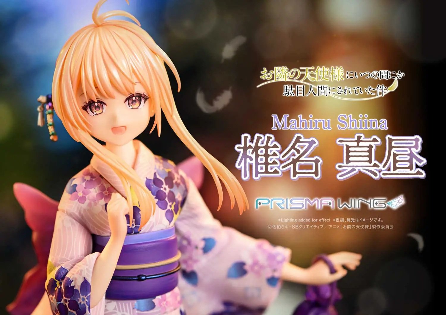 Prime 1 Studio adds Mahiru Shiina from the TV anime "The Angel Next Door Spoils Me Rotten" to their "PRISMA WING" figure series! This figure is inspired by the cover illustration on Volume 6 of the manga; she wears a beautifully patterned yukata, and has caught sight of you in the crowds at the local festival; she hurries over to say hello, her long flaxen hair swaying behind her and an unguarded smile on her face. Her yukata is covered with blooming hydrangeas, and her purple obi has a butterfly-like knot in the back. The base also features hydrangeas, and the coloring changes from dusk to night, evoking memories of summer festivals. You'll love having her in your collection -- place your order today!