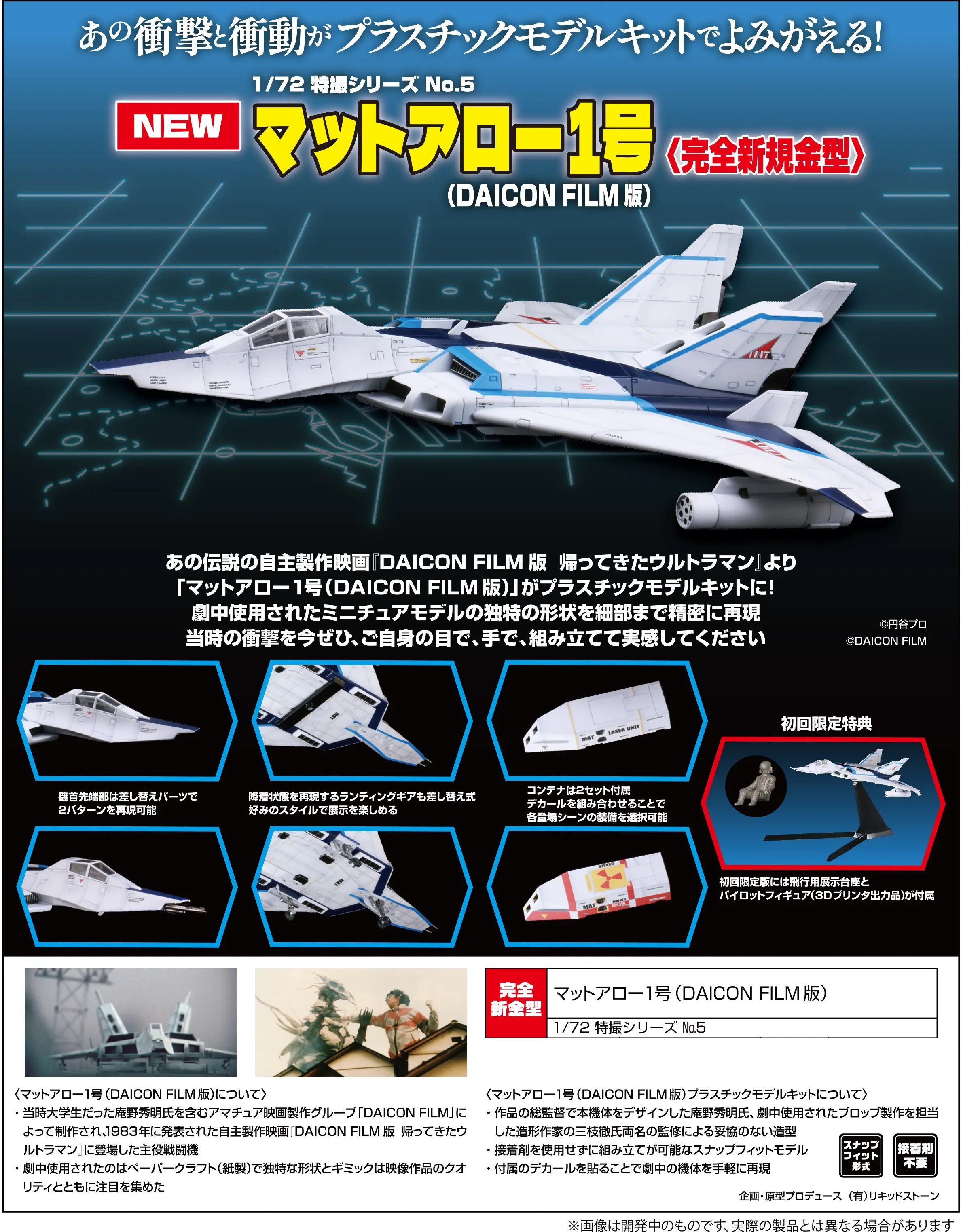 The MAT Arrow from "Ultraman," as seen in 1983's iconic DAICON opening film, is now a plastic model kit from Fujimi! The aircraft in the film was made with papercraft, which attracted a great amount of attention at the time; the original props for the film were made by Hideaki Anno, who was a college student at the time. The unique shape of the miniature model used in the film is accurately reproduced down to the smallest detail; the snap-fit kit can be assembled without adhesive, and decals are included for its markings. The first limited edition of this kit comes with a flight display stand and a pilot figure (3D printed). (These items are only available with the first release of this kit; if yours does not include these items, it was not part of the first release.) Order this amazing model kit for your own collection today!