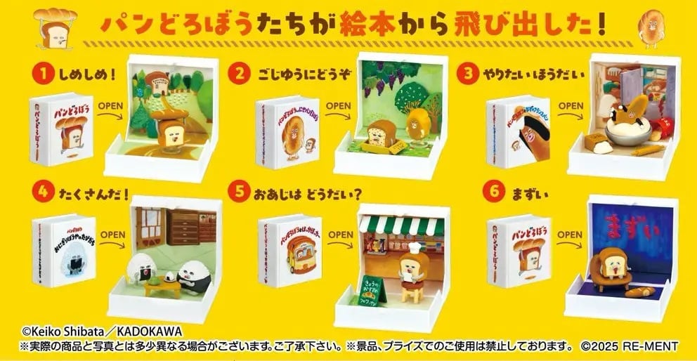 Re-Ment brings us a charming lineup of "Bread Thief" figures! Each one looks like a tiny book; open the book to reveal an adorable figure of that naughty Bread Thief. There are six different items to collect and trade, and you'll get one of each. Place your order today!