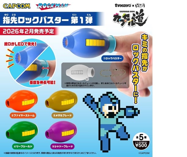 來自人氣遊戲系列《洛克人》的洛克破壞炮震撼登場! 這款「手指洛克破壞炮」可以戴在手指上把玩。產品長度約6.5厘米(收縮狀態),通過伸展底座,手指較大的用戶也能佩戴。 此外,炮口位置還內置LED發光機關!隨產品附贈珠鏈,可作為鑰匙扣使用。 第一彈陣容共包含5種款式1組(共6件),包含:① 洛克破壞砲 (藍色) x2 ② 火焰風暴 (紅色) x1 ③ 金屬電鋸 (棕色) x1 ④ 樹葉飛盾 (綠色) x1 ⑤ 陰影刃 (紫色) X1