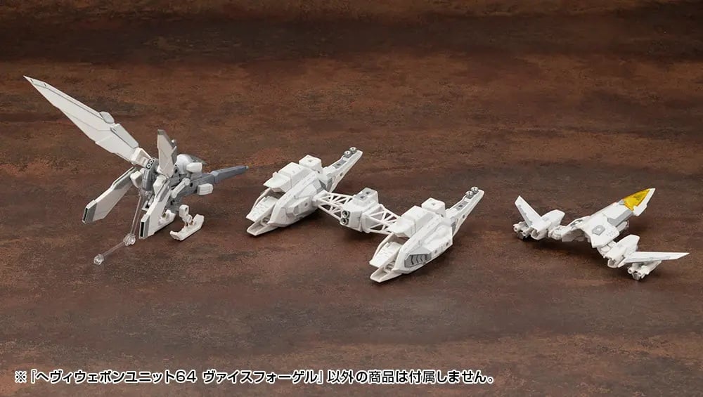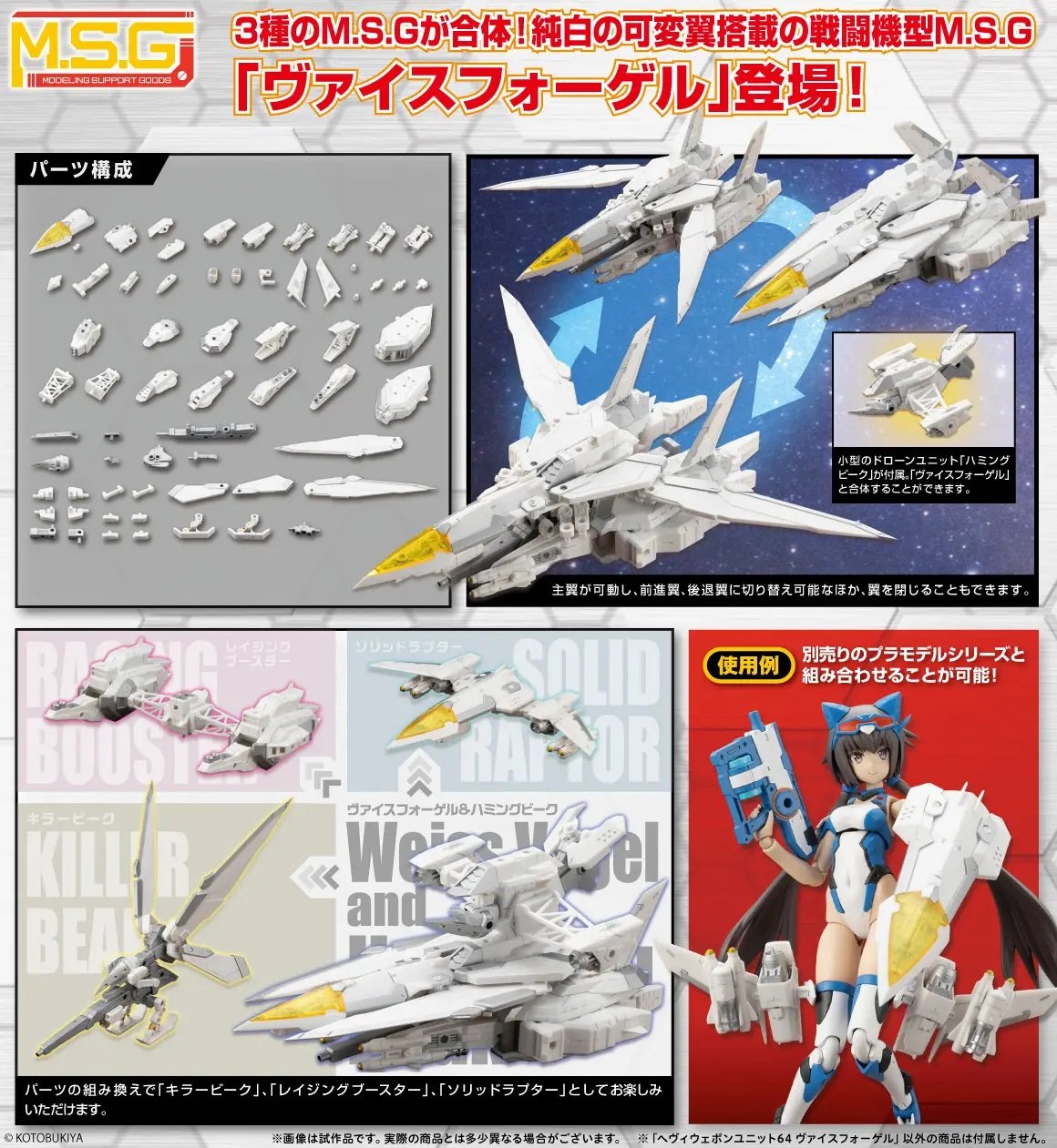 Kotobukiya combines three of its popular "M.S.G" kits -- the Killer Beak, the Raging Booster, and the Solid Raptor -- to create the pure-white variable-wing fighter-type Heavy Weapon M.S.G Weiss Vogel!