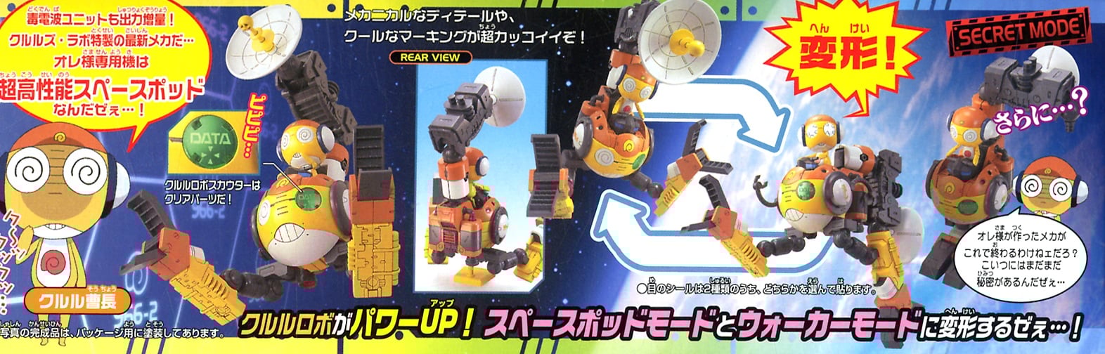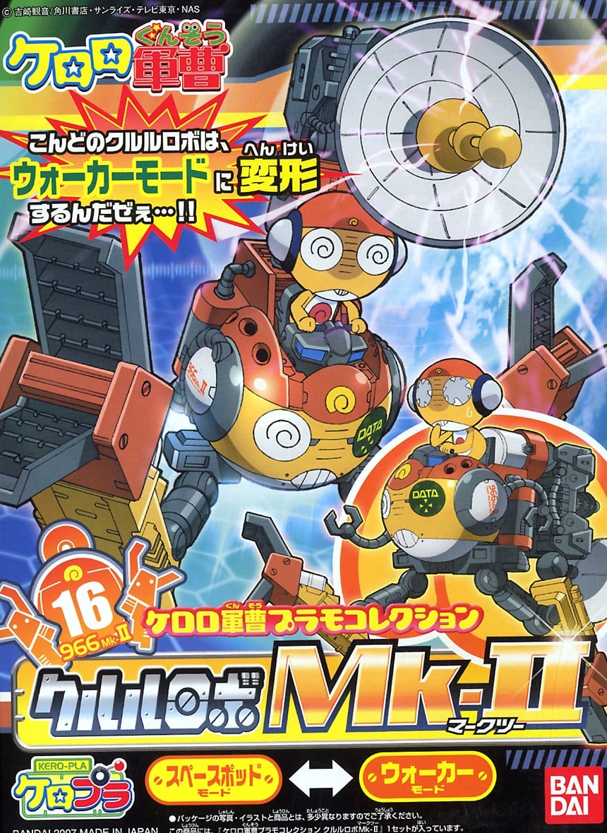 The alien frog invaders are back again to try to conquer the Earth--this time piloting "Mk.II" updates of their previous transforming robots! A simple snap-fit assembly kit, Kururu Robo Mk.II comes in parts molded in color, with a sheet of stickers included to detail it up so no painting is required. Kururu Robo Mk.II is transformable from space pod mode to walker mode, and can be combined with the other four Keroro Platoon members' Mk.II robots (linked below) to form God Keron! (The gray model pictured below is a prototype.)