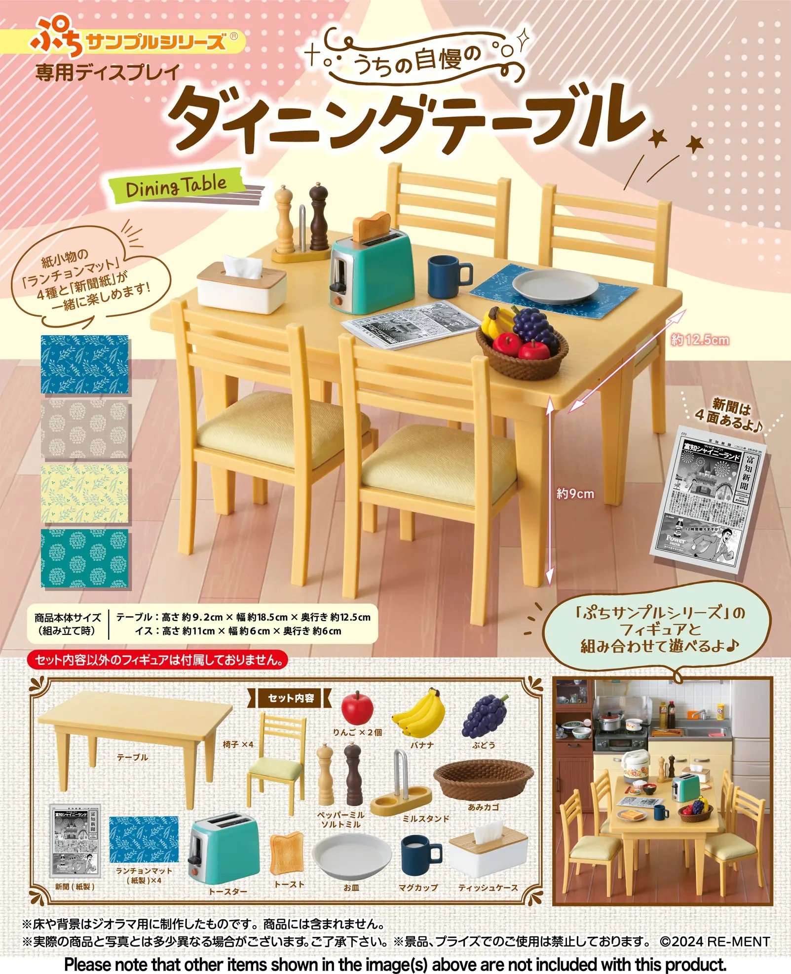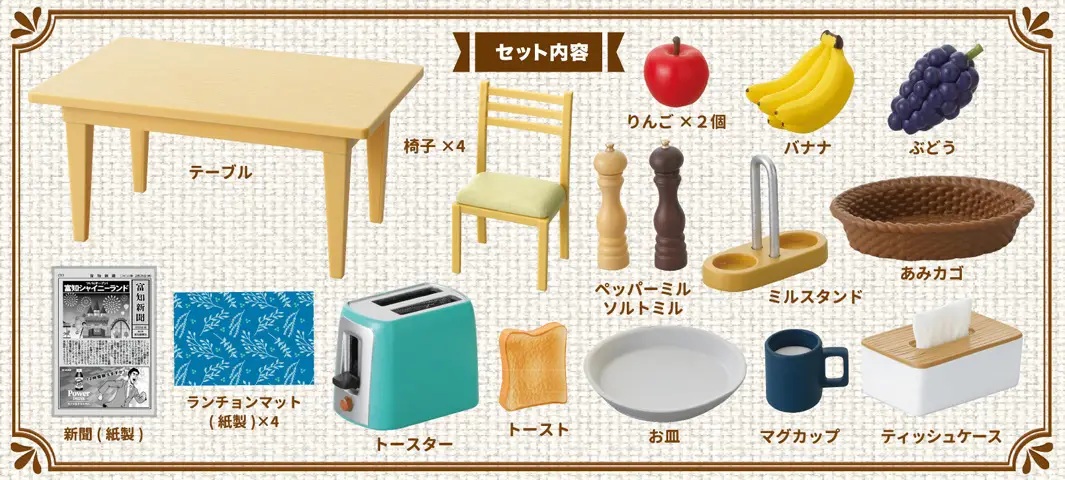 This dining table set is in the same scale as Re-Ment's "Petite Sample" series, and works perfectly to display items from that lineup! Small items are included, such as a pop-up toaster and a bowl of fruit. Order yours today!