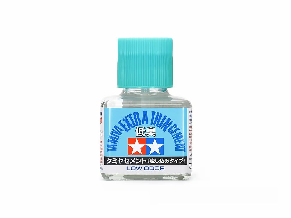 Tamiya welcomes another Tamiya Finishing Material series product – this time, a new version of Tamiya Extra Thin Cement with less odor. The cap has a very thin brush which is useful for plastic model assembly as it can be used to drip this fluid cement into areas like small gaps between plastic parts.
