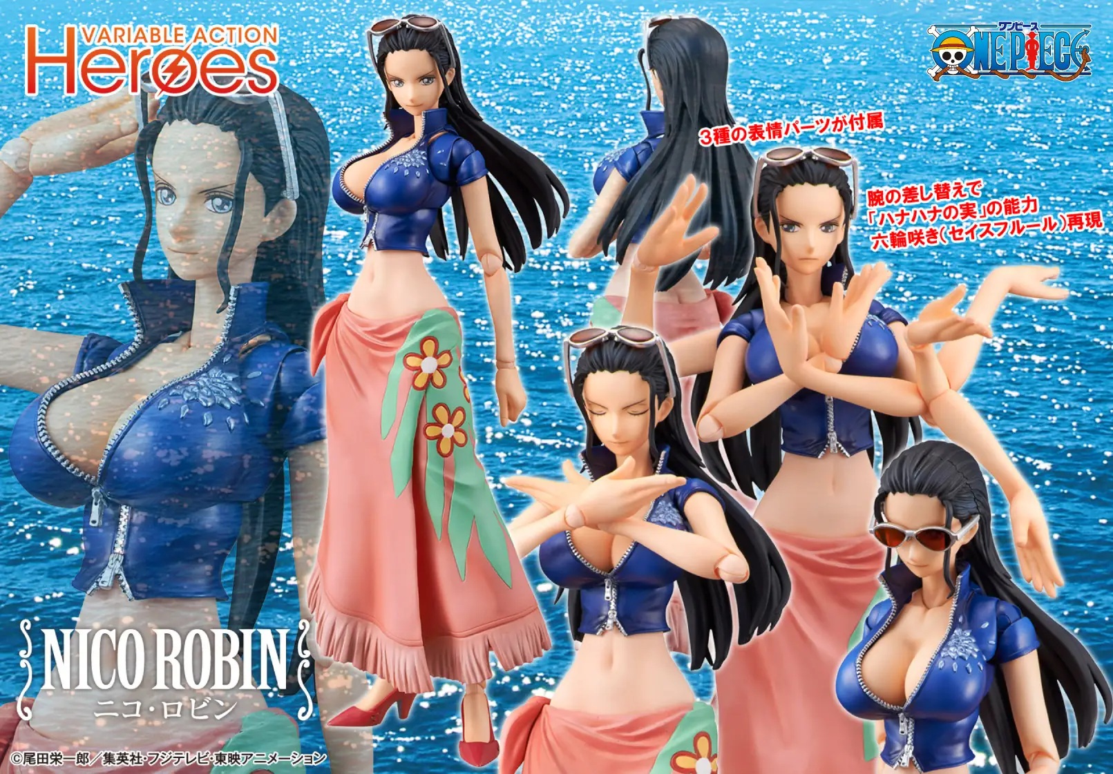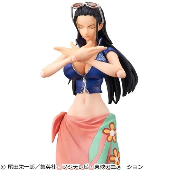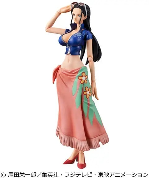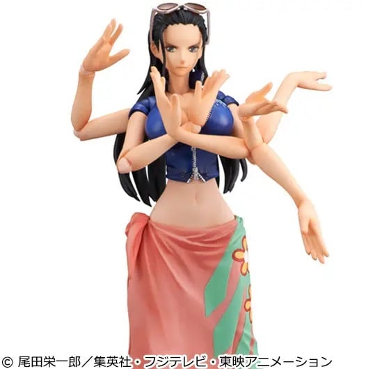 The archaeologist of the Straw Hat Pirate Crew from "One Piece" returns to Mega House's "Variable Action Heroes" series! Based on her post-timeskip design, Robin has long hair and wears a pink shirt and cropped navy jacket. She comes with three interchangeable faces, arm parts to recreate her Hana-Hana Fruit ability, sunglasses, interchangeable hands, and a base for display. Place your order today!