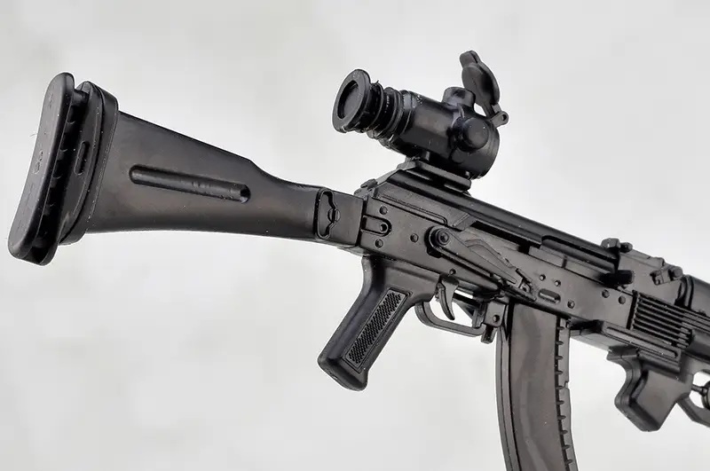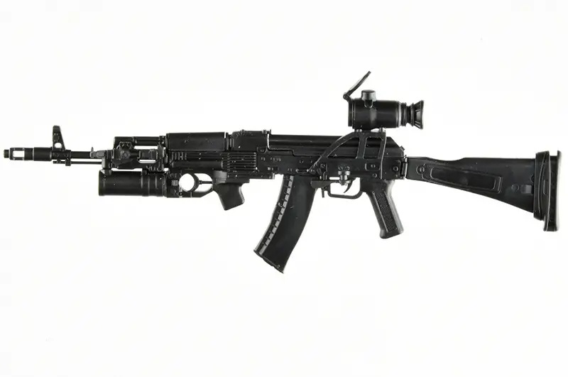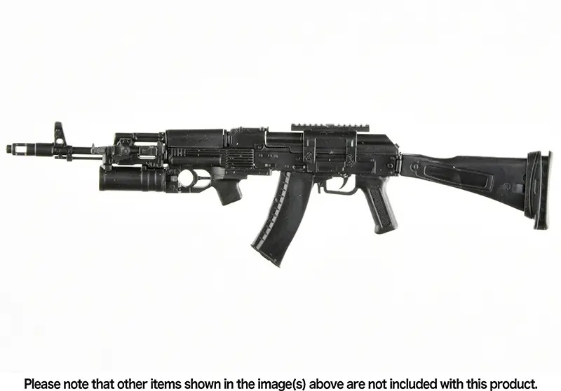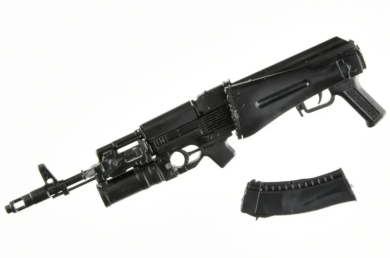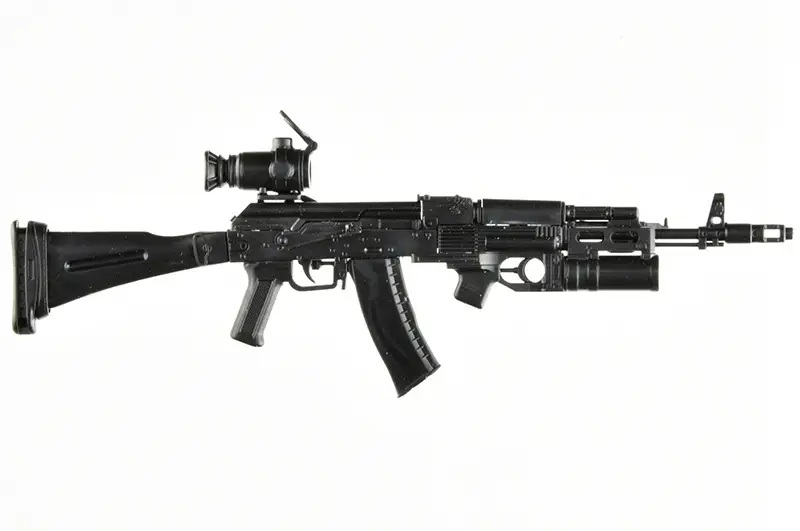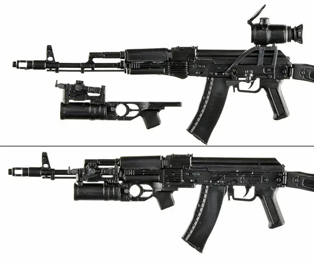 The AK74M is a 5.45mm-caliber rifle officially adopted by the Soviet Union at the end of the Cold War. This modernized model features a folding plastic stock and handguard, and side rails allowing for the attachment of various optical devices. The GP25 under-barrel grenade launcher, an attachment for the AK, uses caseless 40mm grenades, and has been widely used in combat since the Afghanistan conflict as a means to significantly enhance infantry firepower. Its unique cylindrical form and style, mounted below the barrel, are one of the iconic features of the AK series.
