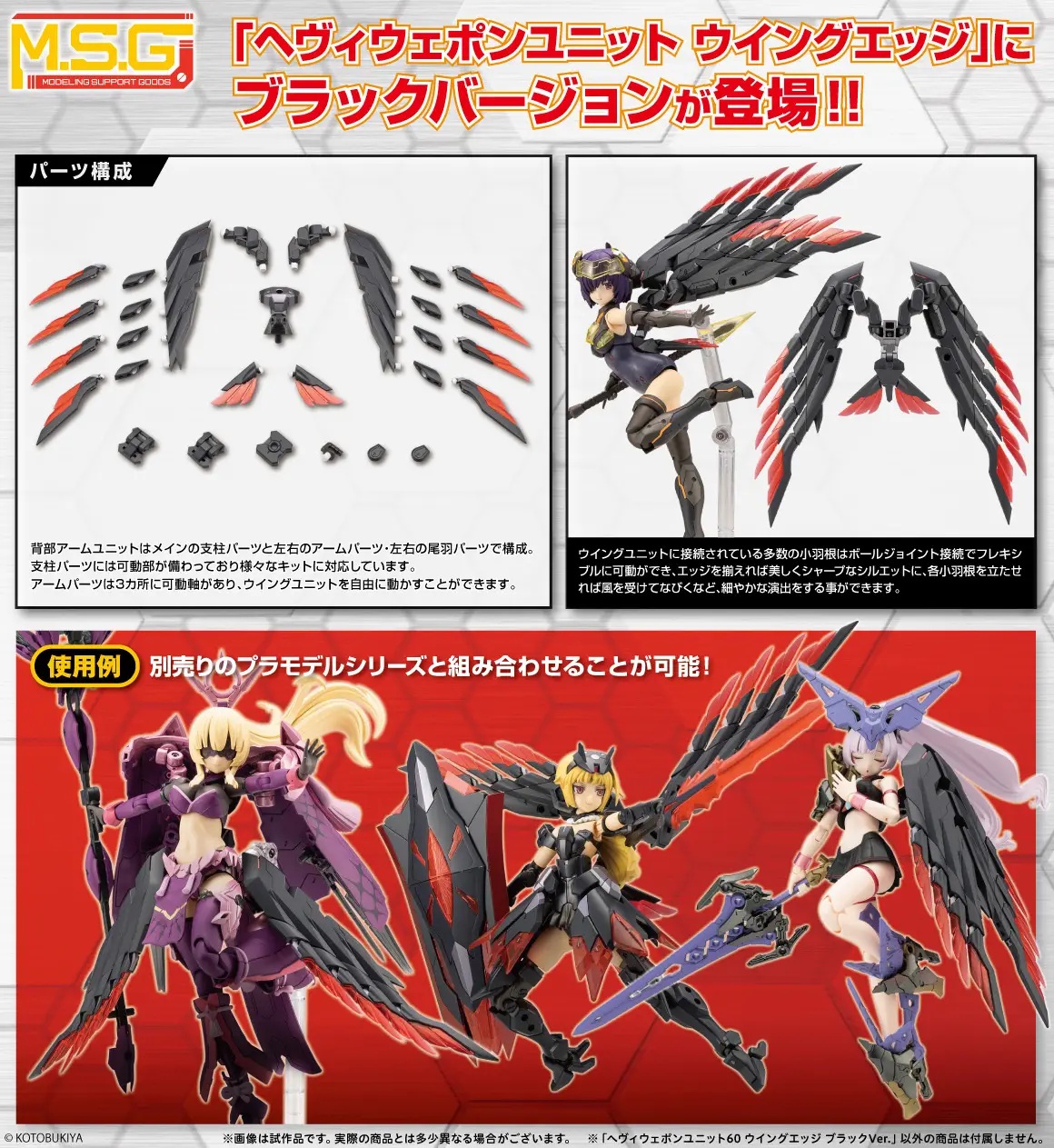 The Heavy Weapon Unit Wing Edge from Kotobukiya's "M.S.G (Modeling Support Goods)" series is now available in a black version! Use the expandable wing unit and highly flexible movable arm unit to customize your plastic robot models and beautiful girl plastic models to your liking, making them even more amazing!